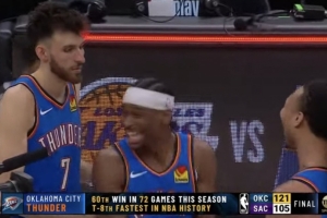 体育资讯3月26日讯 NBA常规赛,雷霆赛季3-0横扫国王,战绩来到60胜12负。