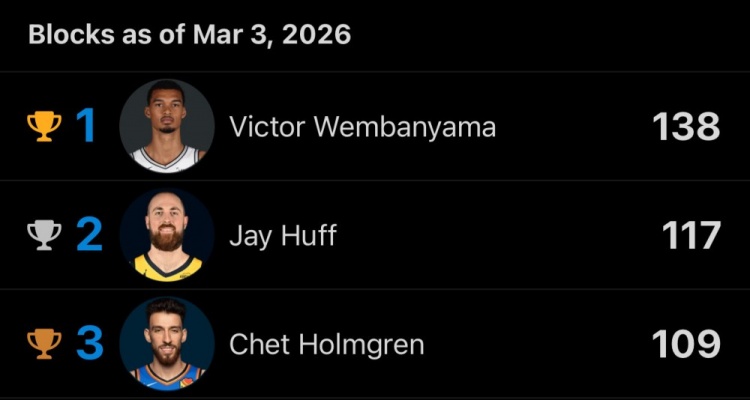 本赛季至今,文班送出138次盖帽领跑全联盟,他仅用了47场比赛,比第二的赫夫(61场,117次)少14场,比第三的霍姆格伦(55场,109次)少8场。