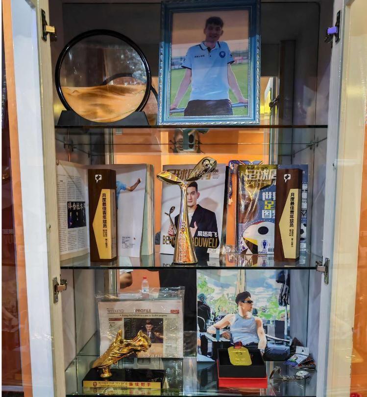他亲手打造一座弧形荣誉陈列架,将拜合拉木获得的所有奖杯错落安放,灯光温柔倾泻其上。